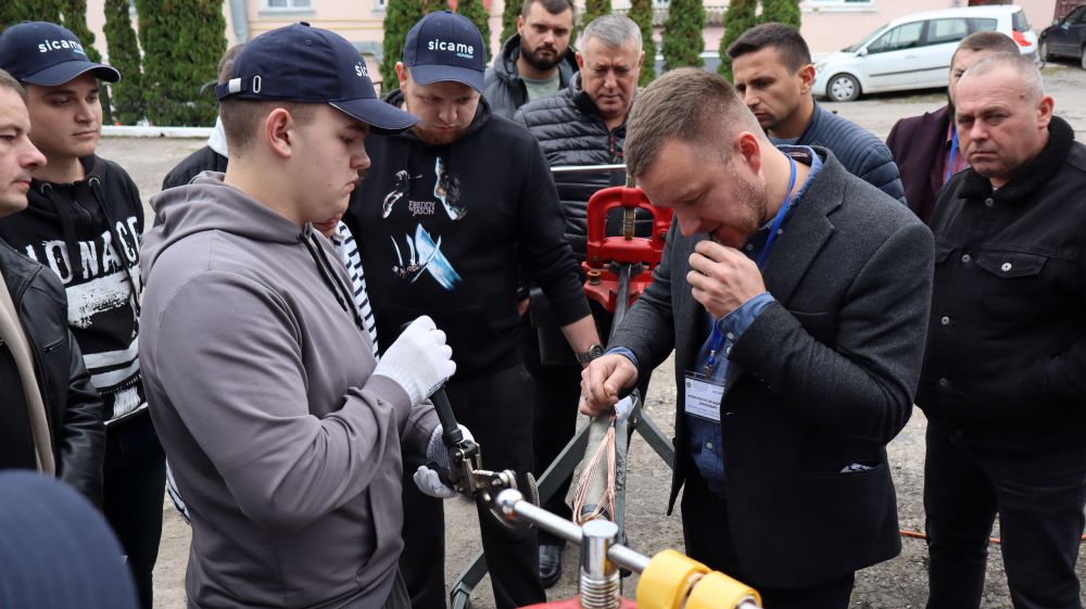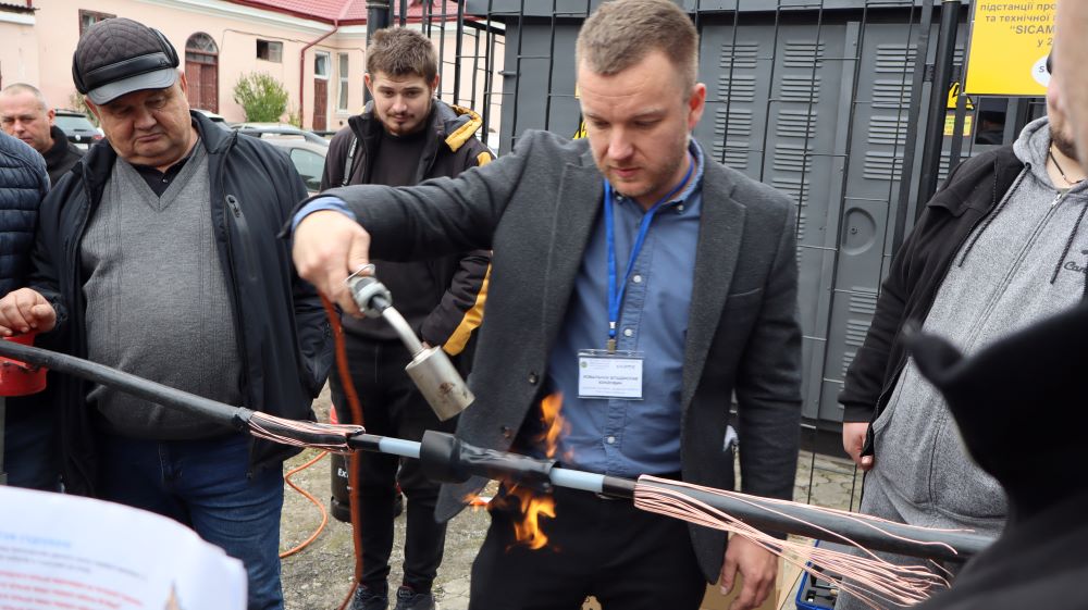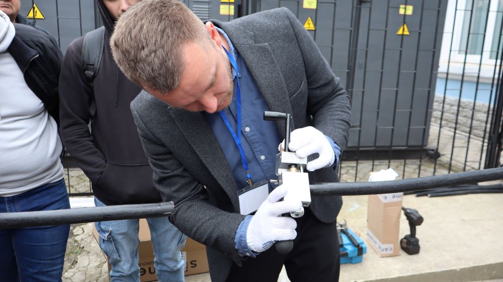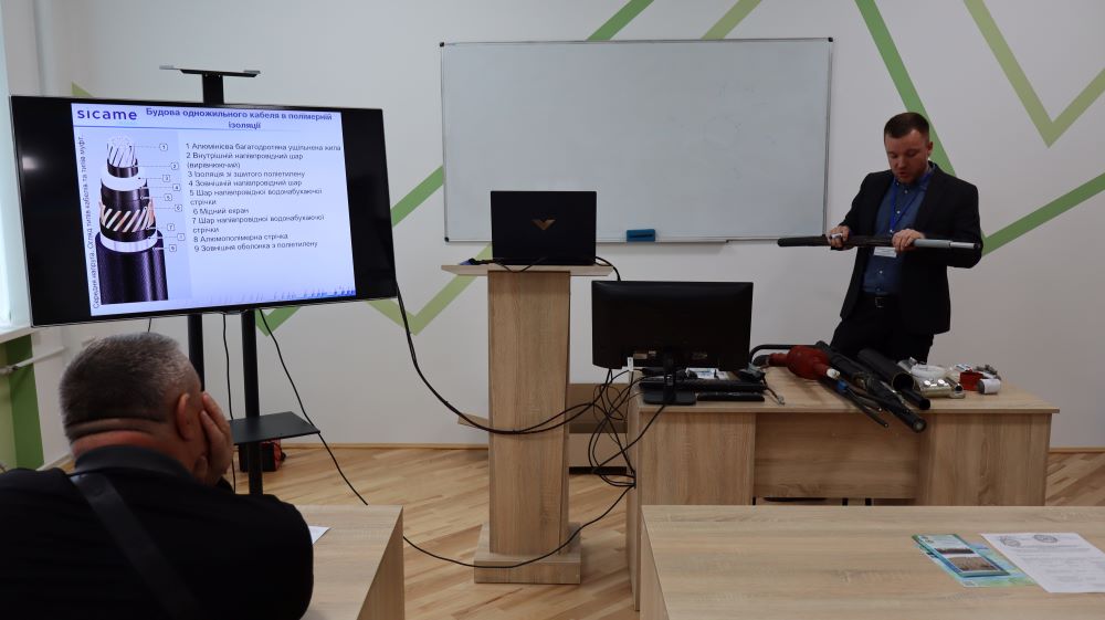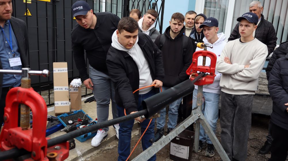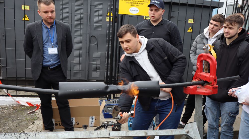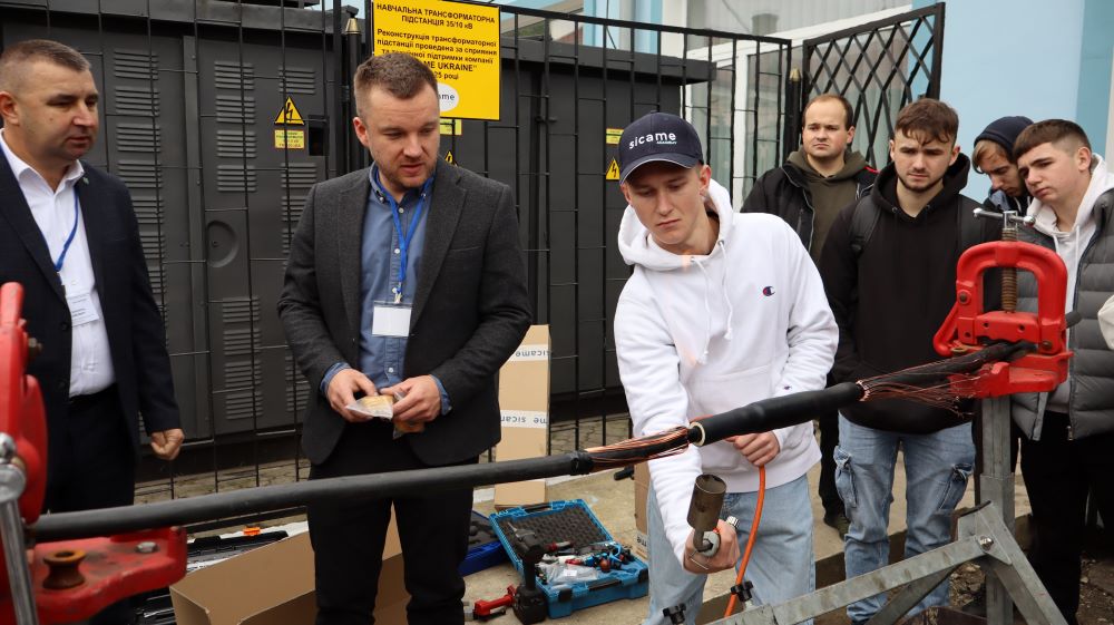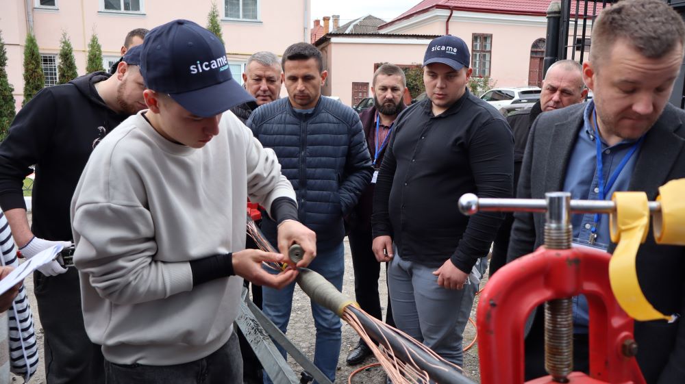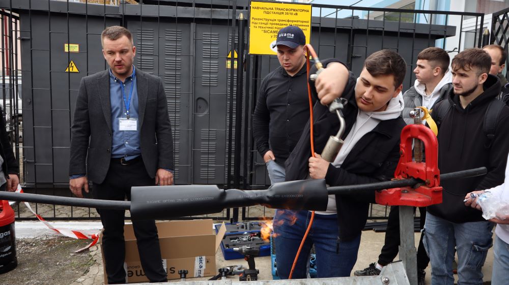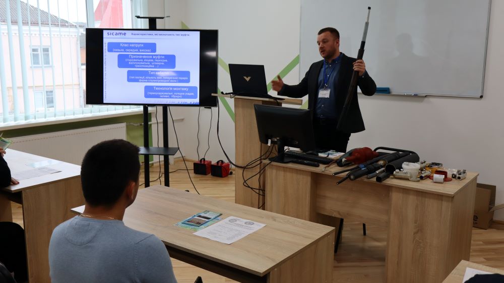 Практична частина, яка відбувалась на майданчику для тренінгів включала підготовку та налаштування інструменту для роботи, розробку кабелю із зшитого поліетилену (6–24 кВ) і монтаж з’єднувальних, кінцевих, перехідних та відгалужувальних кабельних муфт для високовольтного кабелю. Особливу зацікавленість викликали нові рішення SICAME Group – перехідна муфта JTMPTH 12 70-240 СМ, відгалужувальна муфта D3UPTH RSM 50-240 та кінцева муфта холодної усадки E3UERF 24 50-240 СМ, які здобувачі вищої освіти та викладачі монтували вперше.