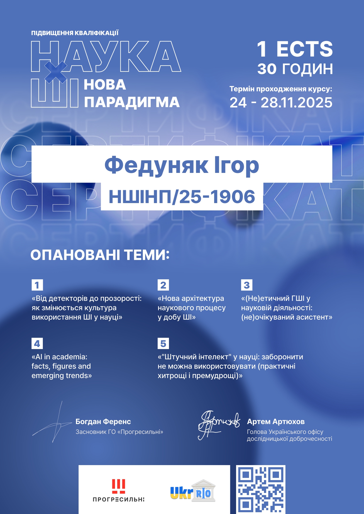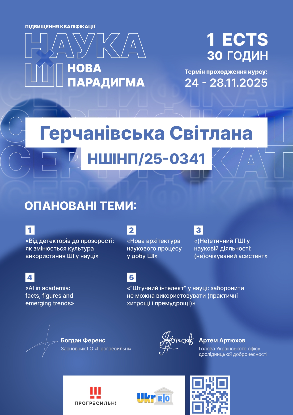 З метою вдосконалення фахових навичок НПП кафедри економіки і менеджменту: Любов ЯРЕМА, Ірина ГУРСЬКА, Галина САРАНЧУК, Світлана ГЕРЧАНІВСЬКА та Ігор ФЕДУНЯК успішно пройшли програму підвищення кваліфікації на тему: «Наука ✕ ШІ: нова парадигма». Навчання відбувалося у період з 24 по 28 листопада 2025 року на базі ГО «Прогресильні» та Українського офісу дослідницької доброчесності.