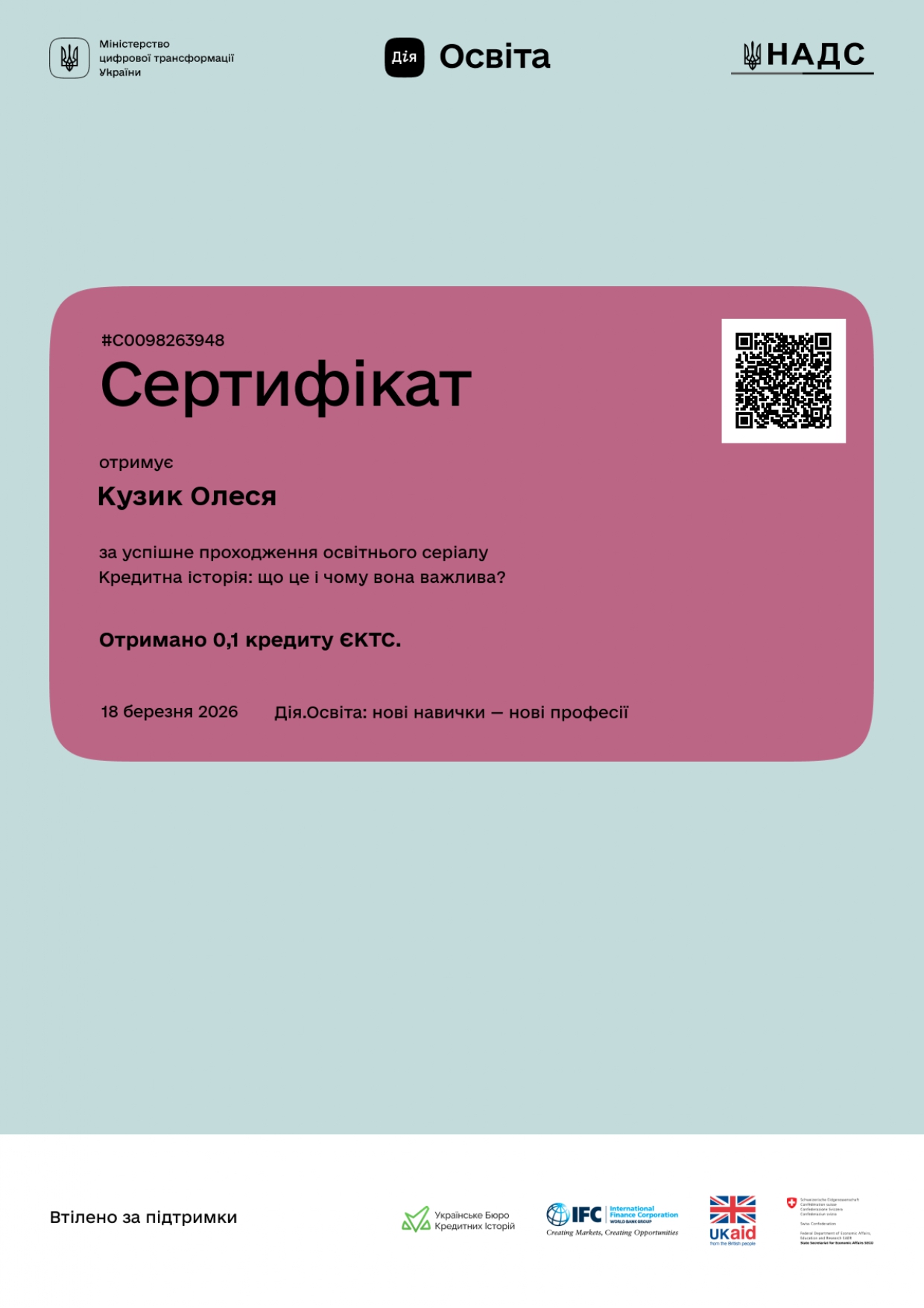 У межах удосконалення компетентностей із дисципліни «Гроші та кредит» здобувачі вищої освіти освітньо-професійних програм «Економіка підприємства» та «Облік і аудит» першого (бакалаврського) рівня Іван ГАЛАНДЖІЙ, Ольга БАБІЙ, Олеся КУЗИК, Олена КОГУТ успішно пройшли освітній серіал «Кредитна історія: що це і чому вона важлива?».