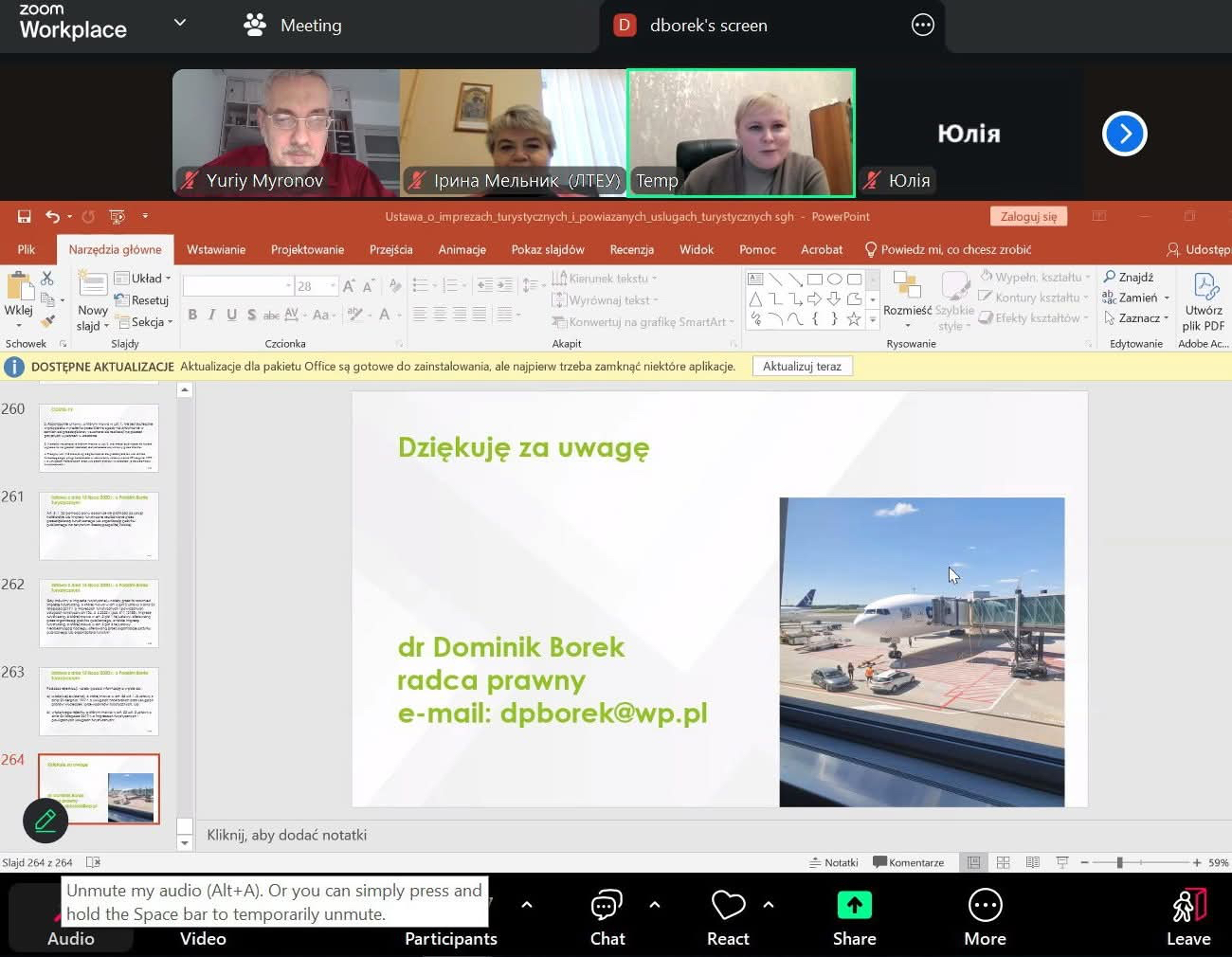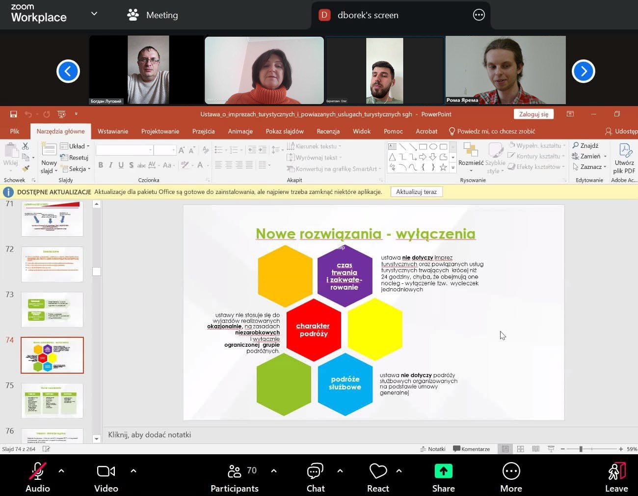 Під час виступу лектор висвітлив особливості державної політики у сфері туризму в Республіці Польща, механізми адміністративно-правового регулювання туристичної діяльності та підходи до забезпечення відповідності туристичних послуг вимогам європейського законодавства. Окремий акцент було зроблено на практичному застосуванні директив Європейського Союзу у формуванні туристичних пакетів.