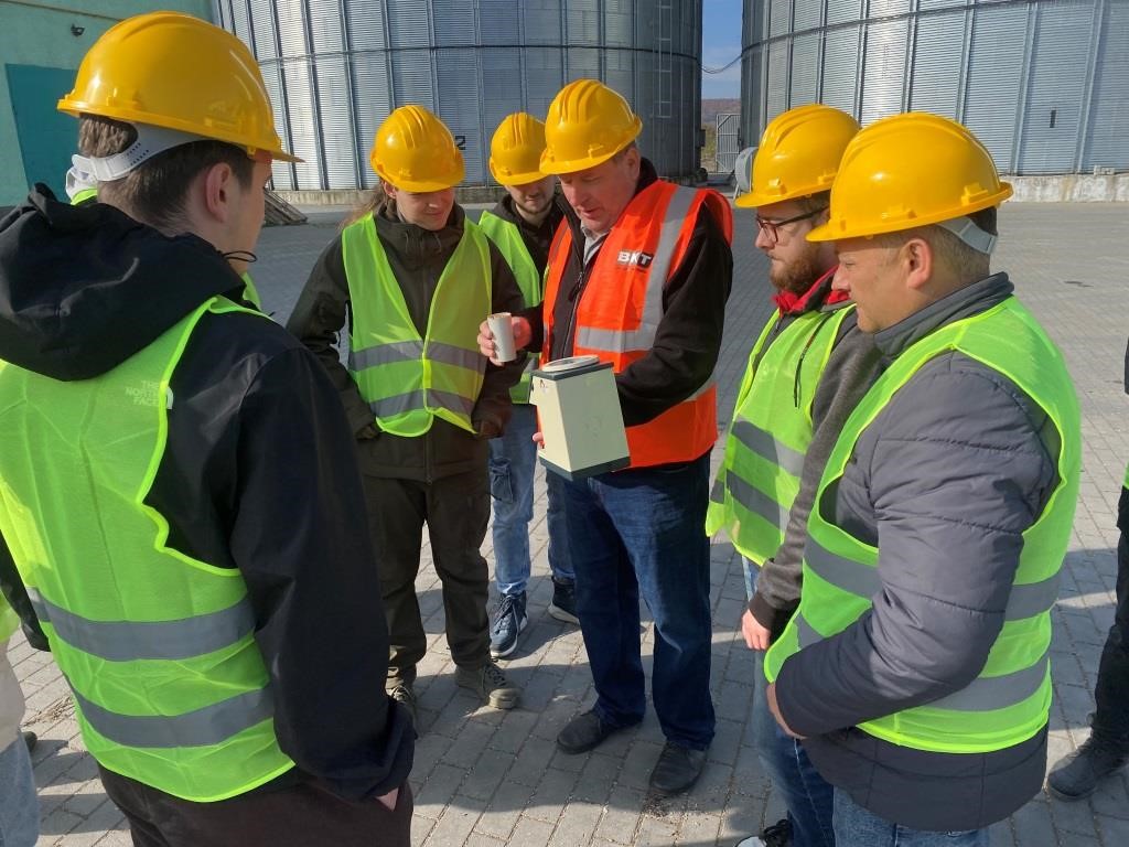 Під час заняття головний інженер підприємства Степан Фурдега детально ознайомив здобувачів вищої освіти із технологічною схемою роботи елеватора, системами електропостачання, управління та автоматизації. Особливу увагу було приділено питанням енергоефективності та надійності електроприводів у технологічних процесах. Потужність елеватора становить 20 тис. т. одночасного зберігання, а встановлення нової зерносушарки французького виробника LAW підвищило продуктивність комплексу до 800 т. на добу, що свідчить про постійний розвиток і впровадження сучасних технологій. Система автоматичного керування елеватора дозволяє здійснювати моніторинг усіх етапів сушіння та зберігання зерна в режимі реального часу, що забезпечує точність, стабільність і безпечність процесів без постійного втручання персоналу.